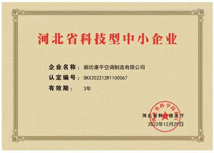經(jīng)過(guò)嚴(yán)格執(zhí)行評(píng)價(jià)標(biāo)準(zhǔn)和流程,廊坊康平空調(diào)制造有限公司喜獲河北省科學(xué)技術(shù)廳頒發(fā)的“河北省科技型中小企業(yè)”榮譽(yù)認(rèn)定稱號(hào),之前,康平空調(diào)已獲得“高新技術(shù)企業(yè)”認(rèn)定。