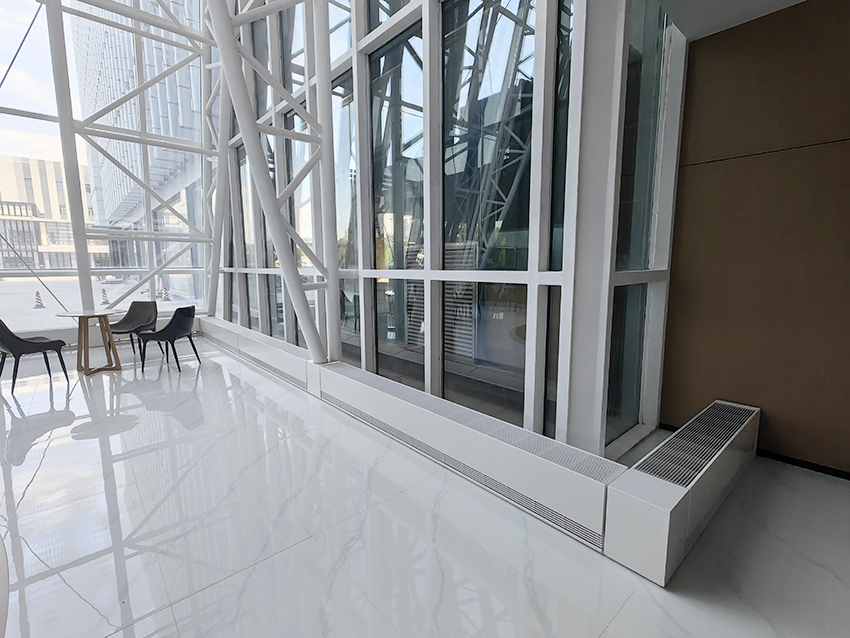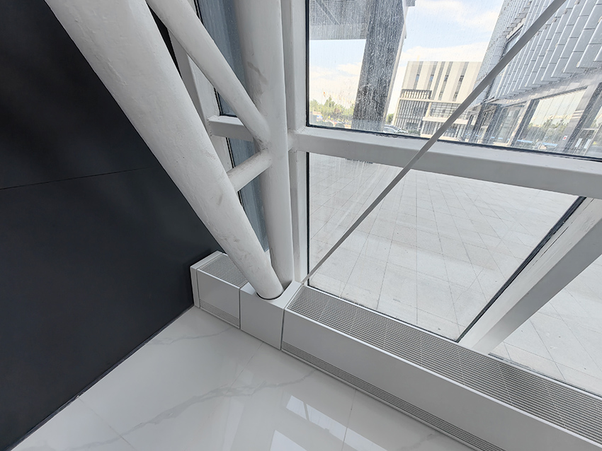 康平空調自主研發(fā)的可三維調節(jié)的幕墻對流散熱器制作工藝及安裝方法,通過U型卡槽微調裝置實現(xiàn)對流罩前面板、對流罩頂面板和分區(qū)隔板的水平面和垂直面上下、前后、左右三維調節(jié)定位,分區(qū)隔板和幕墻散熱器模塊之間留出5-15mm縫隙,補償幕墻長度的累計偏差,滿足了幕墻散熱器的安裝精度要求。